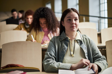 Cute teenage girl in denim jacket making notes while sitting by desk against her classmates and listening to teacher at lecture