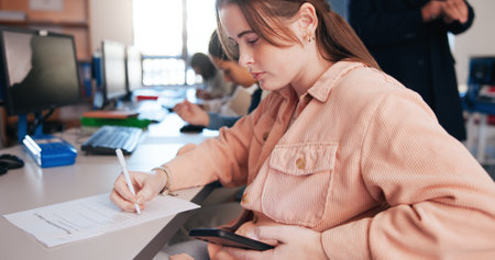Student, writing and cheating note for exam with answers, information and learning in classroom. Liar, girl and phone secret for test with internet, knowledge fraud and corruption for education