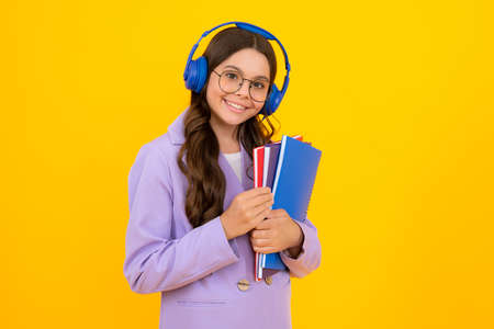 School child girl with headphones and book isoalted on yellow background.