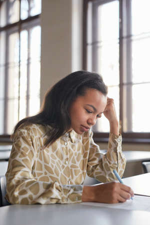Vertical portrait of young African-American woman taking exam in school while sitting at desk in college and thinking, copy space