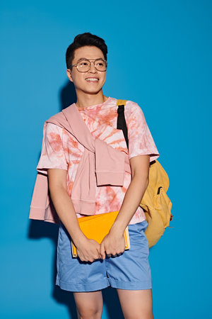 A stylish young man poses energetically in a trendy outfit against a blue backdrop.