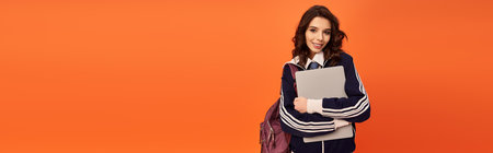 A cheerful young woman poses confidently with her laptop and bag against an orange backdrop, banner