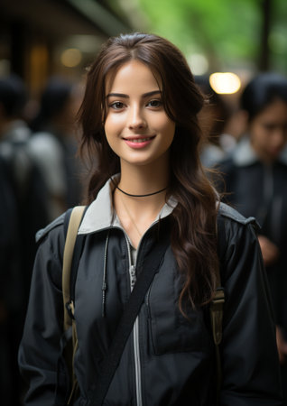 A young woman exudes casual confidence in this portrait She stands against a neutral backdrop, her denim jacket and backpack adding a touch of youthful energy Her relaxed pose and subtle smile capture a sense of independence and optimism The indoor setting provides a clean and contemporary feel AI Generative