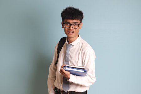 Indonesian senior high school student wearing white shirt uniform with gray tie holding some books, smiling and looking at camera. Isolated image on blue background