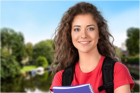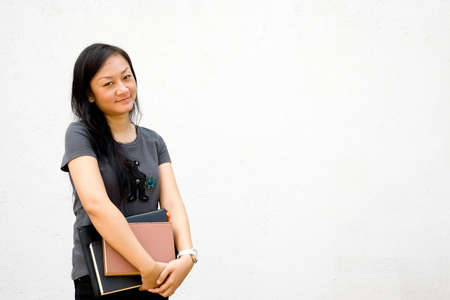 Vertical medium studio portrait shot of attractive young female student wearing casual outfit holding textbooks smiling at camera