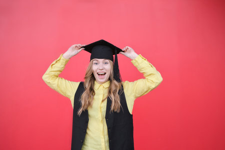 Young beautiful blond female in graduation cap with emotional facial expression on red background. Happy to finish school, college or university High quality photo