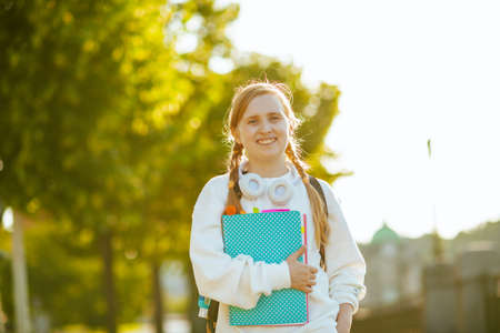 Portrait of charming cheerful young lady arms hold book copybook carry bag toothy smile look camera outdoors