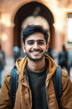 Portrait of a Smiling Indian Student in Front of University. High quality photo