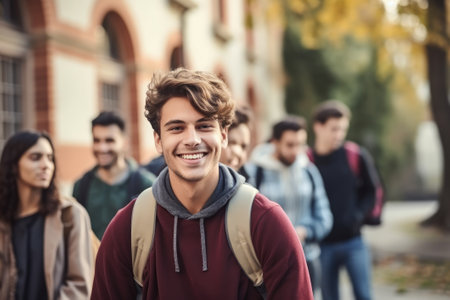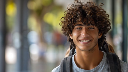 Smiling Male Student with a Backpack in a University Campus on a Sunny Day. High quality photo