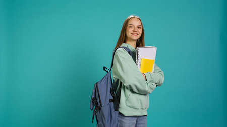 Portrait of smiling woman with backpack holding school notebook and notes, isolated over studio background. Cheerful girl with school supplies in arms, preparing to go to university, camera B