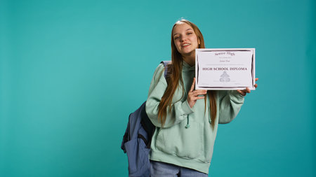 Portrait of smiling student holding high school diploma, celebrating passing classes with high marks, attending graduation ceremony. Happy young girl delighted about receiving certification, camera B