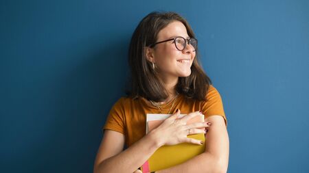 Beautiful woman designer in glasses smiling and looking at the camera holding a stack of papers in his hands on a blue background, happy to perform a complex project, met the deadline.