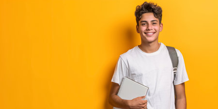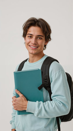 Smiling young man dressed in a light blue sweatshirt holding a teal notebook and wearing a black backpack. Neutral plain background with soft lighting.