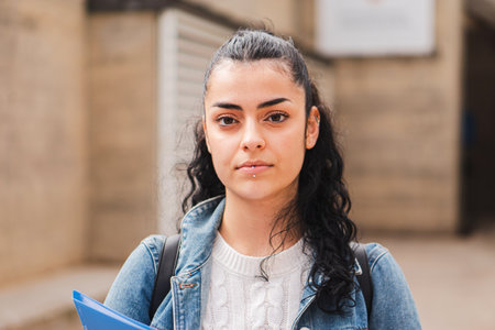 Young hispanic serious girl brunette student looking serious at camera. Juvenile teenage lady standing at university campus. Education concept.
