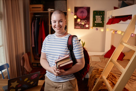 Waist up portrait of bald young woman as female student smiling at camera and holding books in college dorm, copy space
