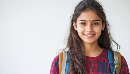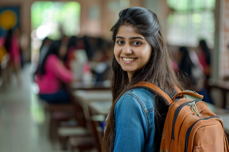 A young woman exudes casual confidence in this portrait She stands against a neutral backdrop, her denim jacket and backpack adding a touch of youthful energy Her relaxed pose and subtle smile capture a sense of independence and optimism The indoor setting provides a clean and contemporary feel AI Generative