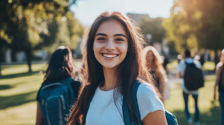 A joyful student with long hair and a backpack enjoys a sunny day on campus, surrounded by classmates, highlighting a vibrant atmosphere of learning and friendship.