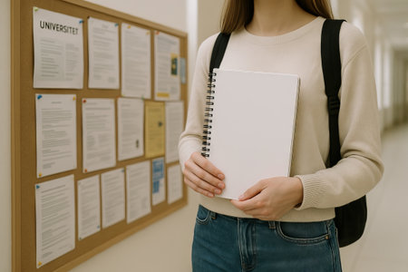 Young woman studying in university hallway holding notebook by bulletin board. concept of education, student life, academic environment.