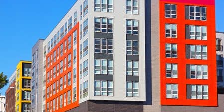 New residential buildings in suburban Virginia, USA. Geometry of colorful modern residential buildings.