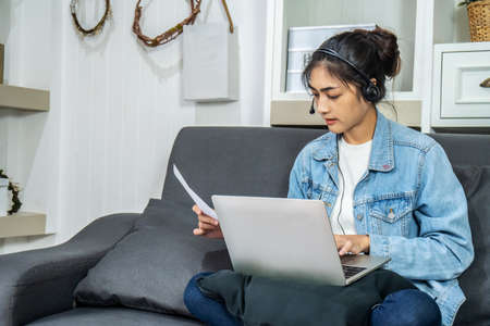Asian young business woman is sitting on the sofa in her own house is wearing headphones video call conference with laptop computer with pile of graph and chart paper at home office, work from home