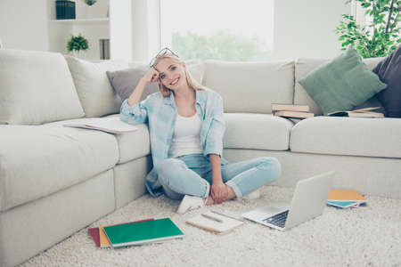 Young contemporary female student in casualwear studying on the floor by bed