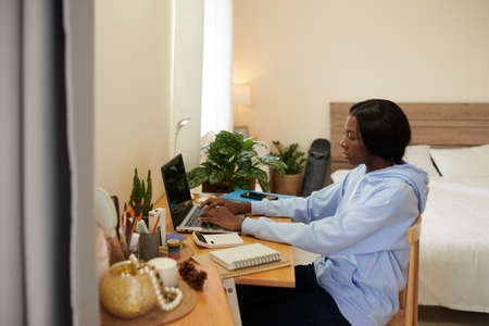 Smart female college student working on laptop in her bedroom, preparing for online test
