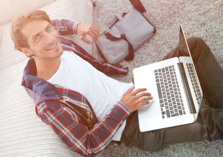 business guy with laptop sitting on carpet in living room.