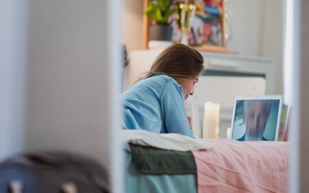 Distance learning online education. Teen schoolgirl studying at home, using laptop. Caucasian girl sitting on bed and doing school homework. Copy space, horizontal shot.