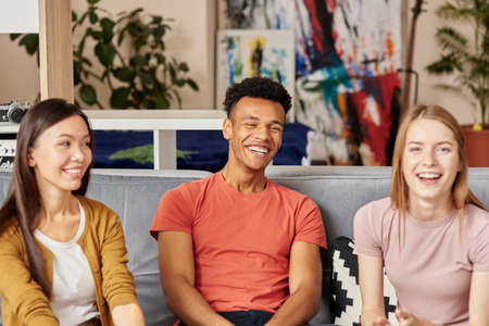True friends. Young multicultural people in casual wear chatting and resting together while sitting on the sofa at home. Happy friends enjoying time together