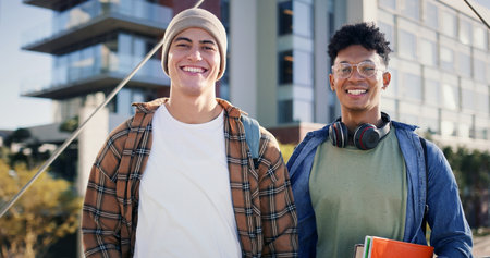 University, men and portrait of friends on outdoor bridge with student notebook, happy and together at college. Diversity, smile and morning with textbook and education in New York with learning