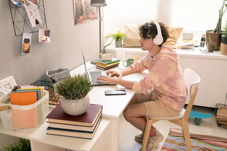 Contemporary teenager sitting by table in front of laptop in domestic room
