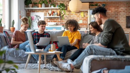 Group of multiethnic friends sitting on sofa in living room and using laptop