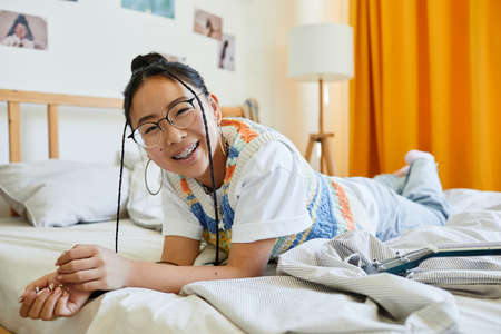 Portrait of carefree teenage girl laying on bed in cozy room and looking at camera