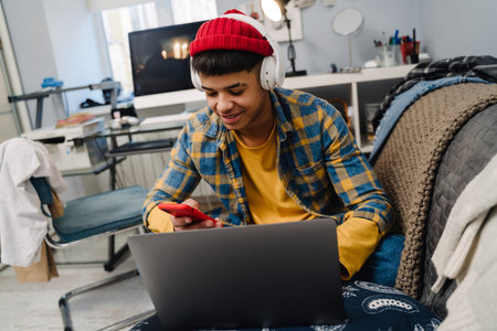 Middle-eastern teenage boy using laptop and cellphone while sitting on couch at home