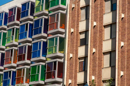 A closeup shot of a building with colorful windows in Bilbao, Spain