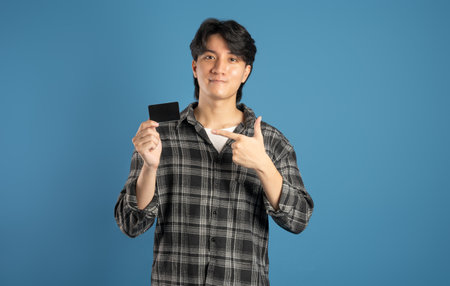 young latin man student university holding a credit card for shopping on blue background in Mexico Latin America