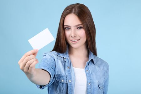 Happy girl holding black business card. Credit card mockup, young girl at home with template, background