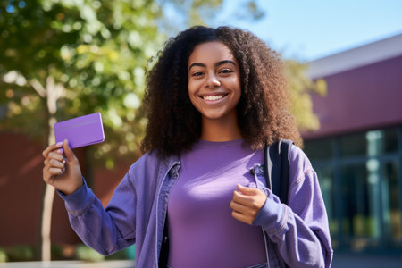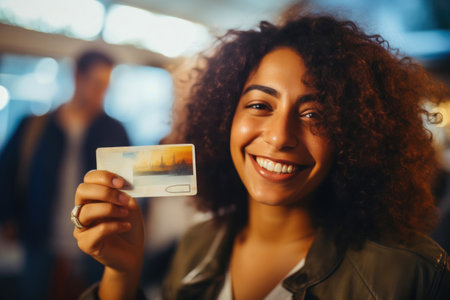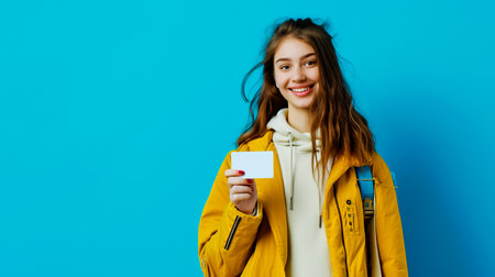 A girl is holding a white card and smiling. The card is likely a credit card, and the girl is posing for a picture