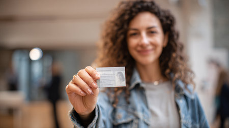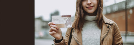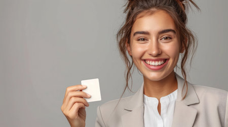 Businesswoman with a friendly smile, holding a business card. Copy space available on the left side.