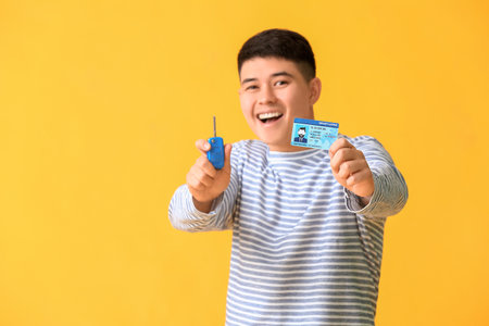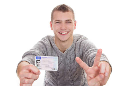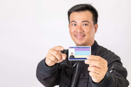 Portrait rider in black jacket holding and show blank Thailand driving licence. Over 400cc motorcycle in Thailand need especially licence. Studio shot isolated on grey background