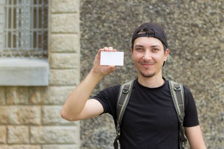 A young guy with a backpack is holding a clean business card with a place to place text or an inscription on a blurred background of a historic building, mocap, toned