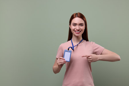 Smiling woman pointing at vip pass badge on pale green background, space for text
