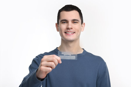 Portrait of attractive businessman holding blank business card, empty space for layout, with white background