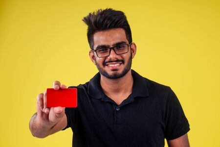 Cropped shot of young male hands holds blank card with copy space for your text or advertising content. Young businessman wears t shirt shows business card. Film effect. Advertising concept