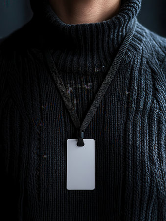 A person stands wearing a dark, ribbed sweater, showcasing a blank identification tag hanging from a black lanyard. The soft lighting emphasizes the simplicity and potential uses of the tag.