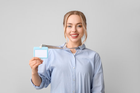 Business girl with a name tag on her neck. Isolated on a gray path.