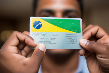 Indian school boy wearing dark blue school uniform, with smiling face shows her blurred aadhar card in her hand. blurry background