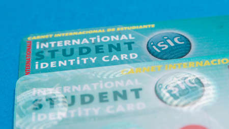 CLUJ, ROMANIA - NOV 08, 2019: The International Student Identity Card (ISIC) is an internationally accepted proof of bona fide student status. Student Identity Card, ISIC on a blue background.