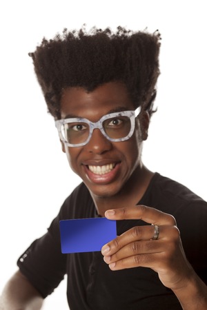 A man holds up a credit card as he prepares to make a payment transaction, Happy black man holds his credit card towards the camera, AI Generated