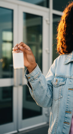 Confident young woman holding blank identification badge outdoors near modern glass building entrance in natural sunlight.